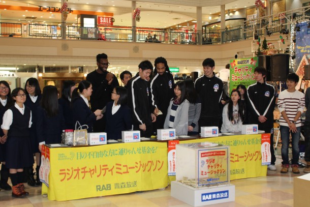 2015年12月24日(木)青森市のサンロード青森で「RABラジオチャリティ・ミュージックソン」の募金活動やステージイベントが行われ、青森ワッツから選手5名が活動のお手伝いをしました。