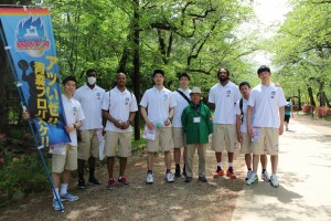 下山大地選手は「高校時代に歩いた街、みんなと歩けて嬉しい」と、母校 青森県立弘前高等学校前で記念写真。